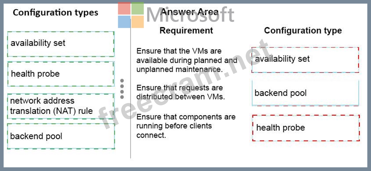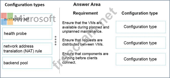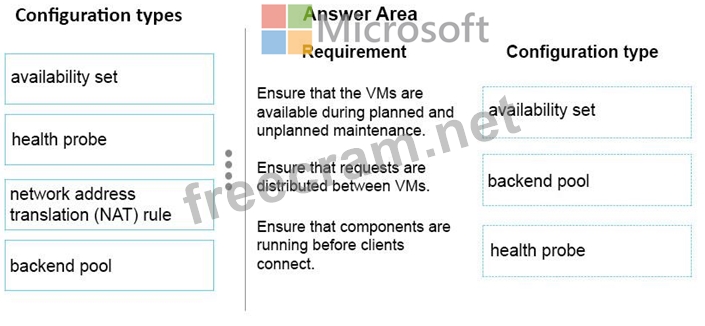 The application must be available during planned and unplanned Azure maintenance events. Incoming client requests must be distributed across the three VMs. Clients must be connected to a VM only if both application components are running.