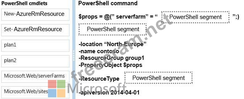 How should you complete the Azure PowerShell command?? To answer, drag the appropriate Azure PowerShell segment to the correct location. Each PowerShell segment may be used once, more than once, or not at all. You may need to drag the split bar between panes or scroll to view content.