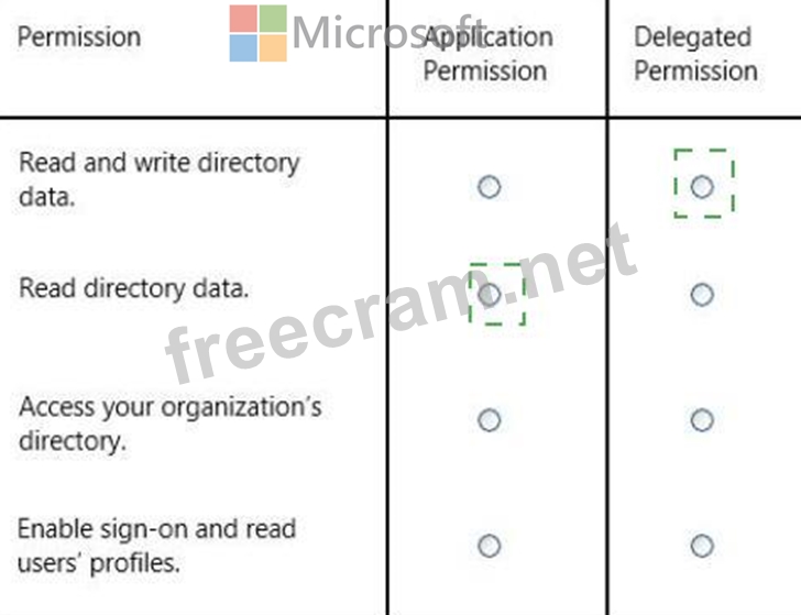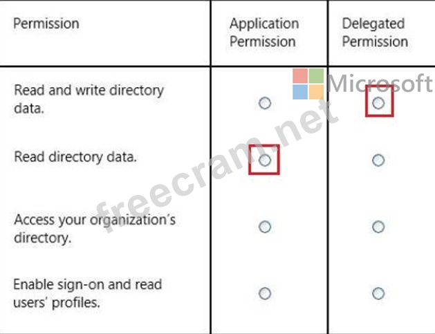 In the table below, identify the permission that must be granted to the application. Make only one selection in each column.