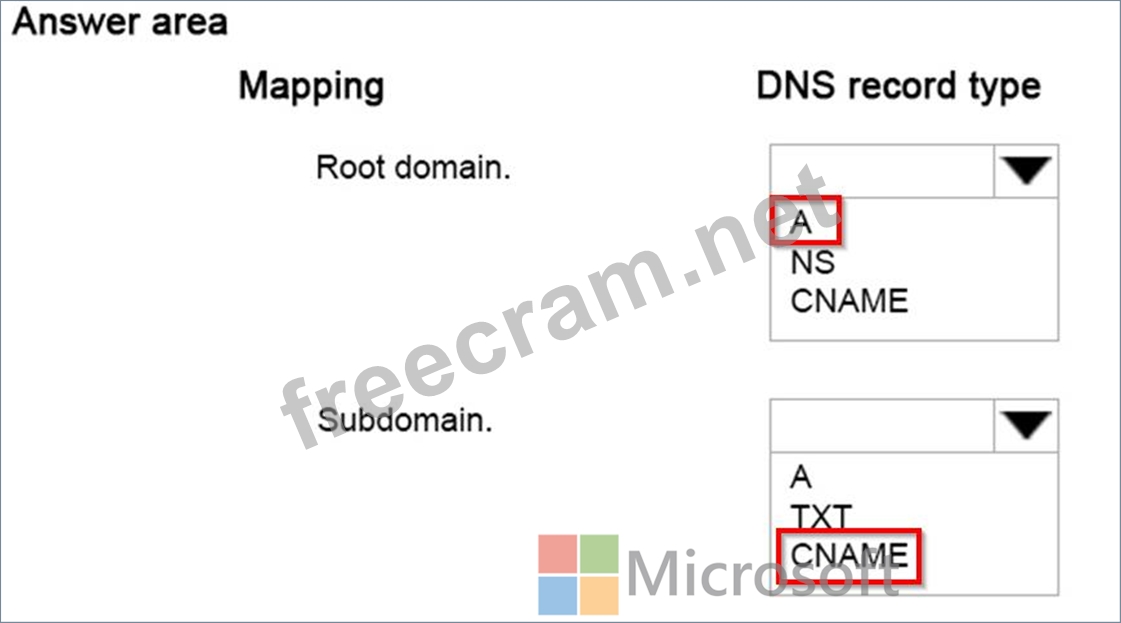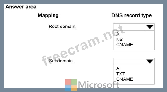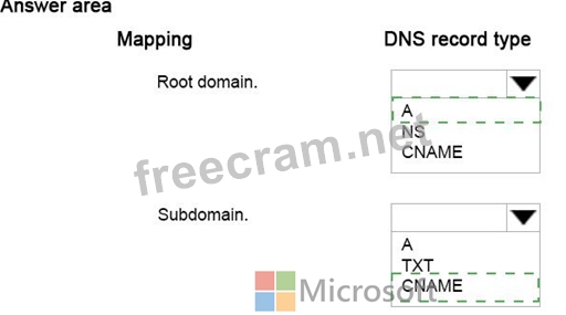 For each mapping, which DNS record type should you create? To answer, select the appropriate DNS record type from each list in the answer area.