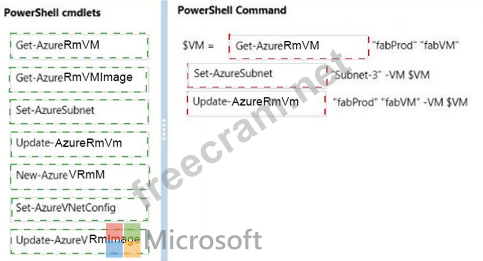 What should you do? To answer, drag the appropriate Power Shell cmdlet to the correct location in the Power Shell command. Each cmdlet may be used once, more than once, or not at all. You may need to drag the split bar between panes or scroll to view content.