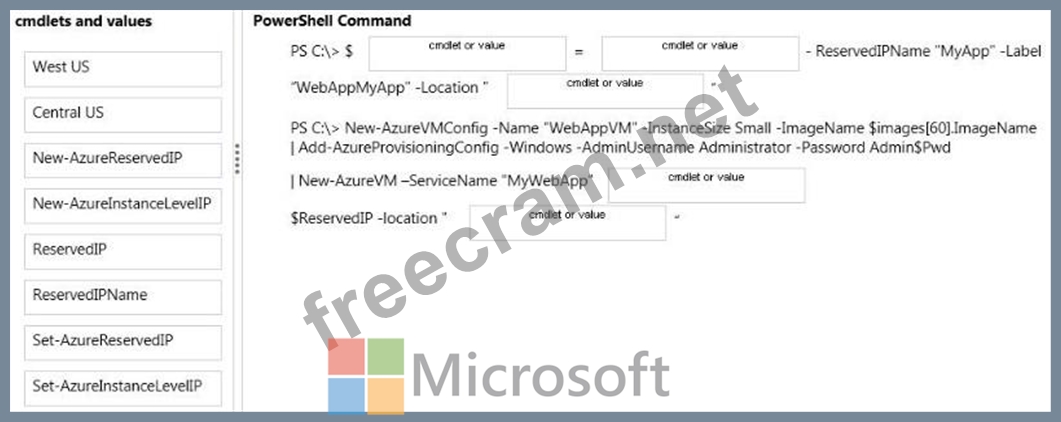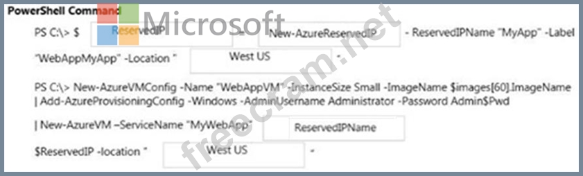 Which Azure Power Shell cmdlets and values should you use? To answer, drag the appropriate cmdlet or value to the correct location in the PowerShell command. Each cmdlet or value may be used once, more than once, or not at all. You may need to drag the split bar between panes or scroll to view content