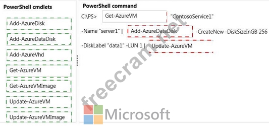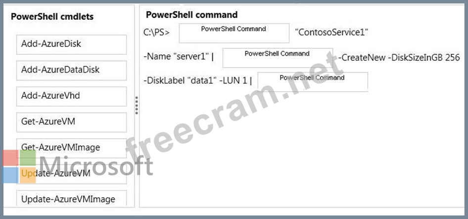 Which Power Shell cmdlets should you use? To answer, drag the appropriate cmdlet to the correct location in the Power Shell command. Each cmdlet may be used once, more than once, or not at all. You may need to drag the split bar between panes or scroll to view content.