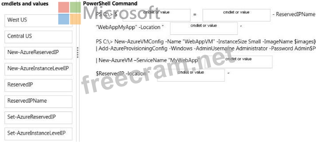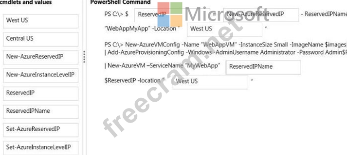 Which Azure Power Shell cmdlets and values should you use? To answer, drag the appropriate cmdlet or value to the correct location in the PowerShell command. Each cmdlet or value may be used once, more than once, or not at all. You may need to drag the split bar between panes or scroll to view content Select and Place: