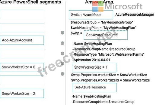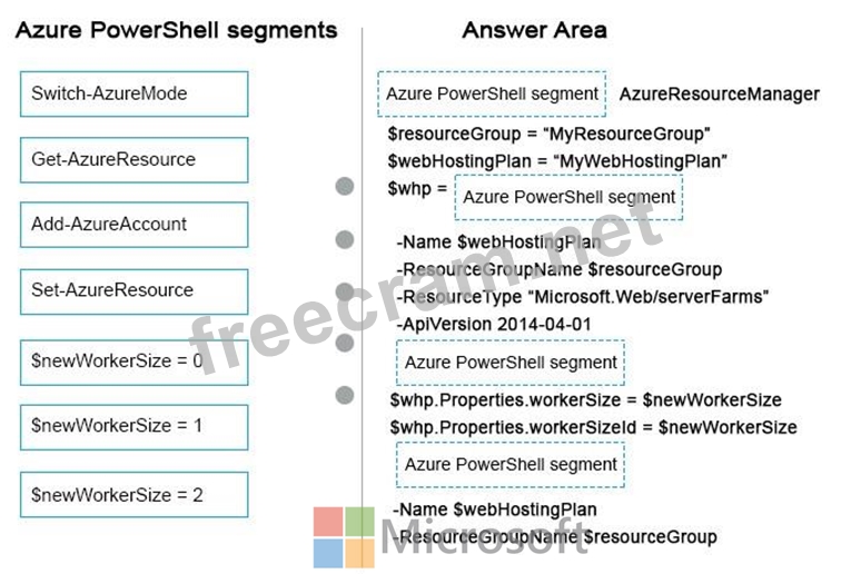 How should you complete the Azure PowerShell script? To answer, drag the appropriate Azure PowerShell segments to the correct locations. Each Azure PowerShell segment may be used once, more than once, or not at all. You may need to drag the split bar between panes or scroll to view content.