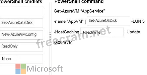Which Microsoft Azure Power Shell cmdlet should you use with each Power Shell command line? To answer, drag the appropriate Microsoft Azure Power Shell cmdlet to the correct location in the Power Shell code. Each Power Shell cmdlet may be used once, more than once, or not at all. You may need to drag the split bar between panes or scroll to view content.
