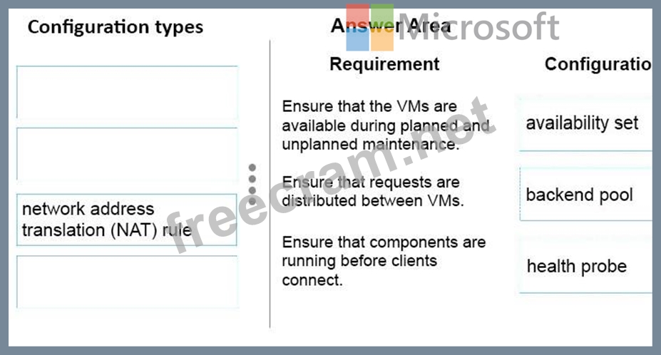 For each requirement, what should you implement? To answer, drag the appropriate configuration type to the correct target. Each configuration type may be used once, more than once, or not at all. You may need to drag the split bar between panes or scroll to view content.
