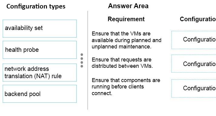 The application must be available during planned and unplanned Azure maintenance events. Incoming client requests must be distributed across the three VMs. Clients must be connected to a VM only if both application components are running.