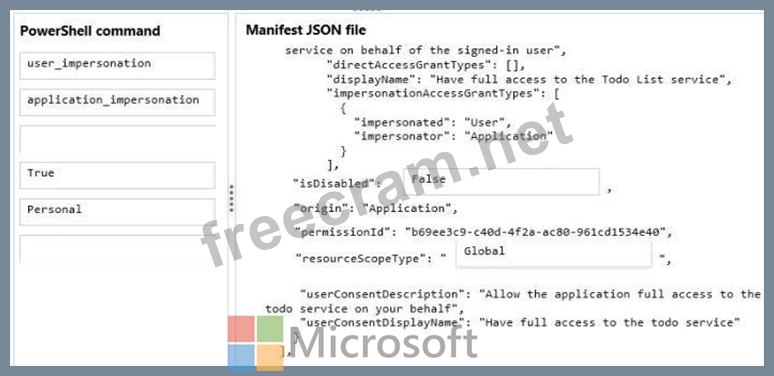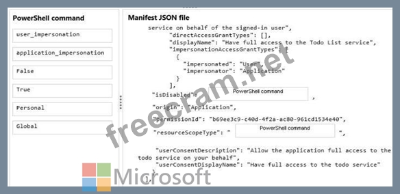 How should you configure MyApp's manifest JSON file? To answer, drag the appropriate PowerShell command to the correct location in the application's manifest JSON file. Each value may be used once, more than once, or not at all. You may need to drag the split bar between panes or scroll to view content.