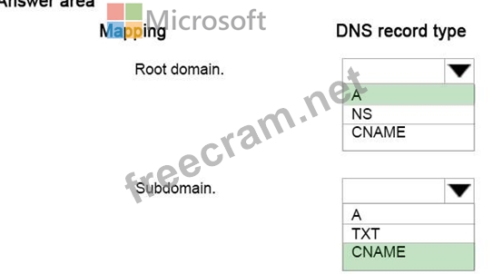 For each mapping, which DNS record type should you create? To answer, select the appropriate DNS record type from each list in the answer area.