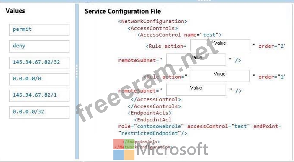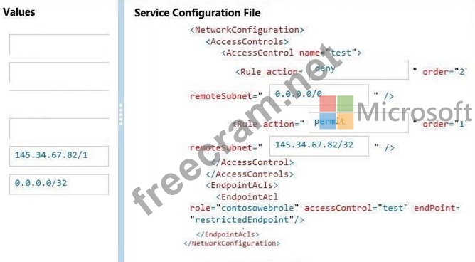 Which values should you use within the service configuration file? To answer, drag the appropriate value to the correct location in the service configuration file. Each value may be used once, more than once, or not at all. You may need to drag the split bar between panes or scroll to view content.