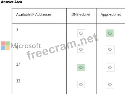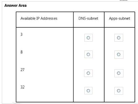 You design the virtual network to include two subnets, one named DNS-subnet and one named Apps- subnet, as shown in the exhibit. (Click the Exhibits button.)