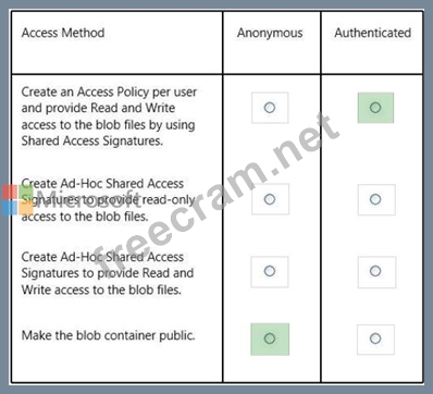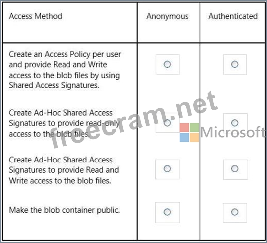 In the table below, identify the access method that should be used for the anonymous and authenticated parts of the application. Make only one selection in each column.