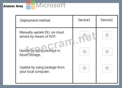 You manage two cloud services named Service1 and Service2. The development team updates the code for each application and notifies you that the services are packaged and ready for deployment.