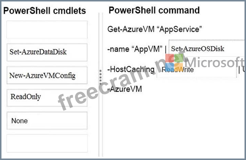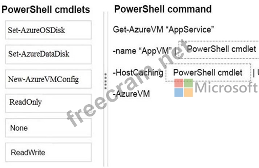Which Microsoft Azure PowerShell cmdlet should you use with each PowerShell command line? To answer, drag the appropriate Microsoft Azure PowerShell cmdlet to the correct location in the PowerShell code. Each PowerShell cmdlet may be used once, more than once, or not at all. You may need to drag the split bar between panes or scroll to view content.