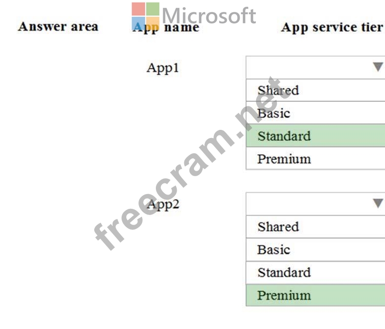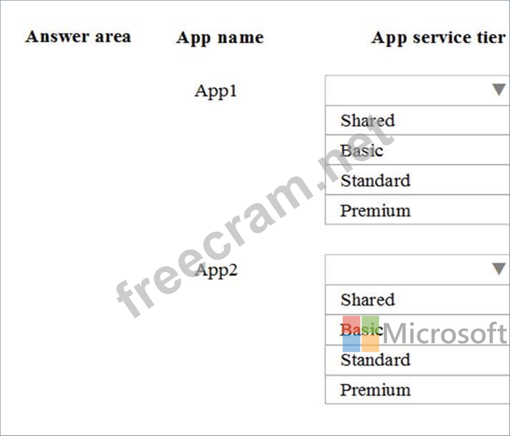 Which service tier should you use for each app? To answer, select the appropriate options in the answer area.