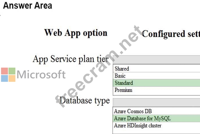How should you configure the web app App Service? To answer, select the appropriate options in the answer area.