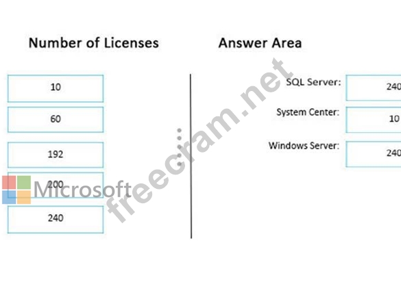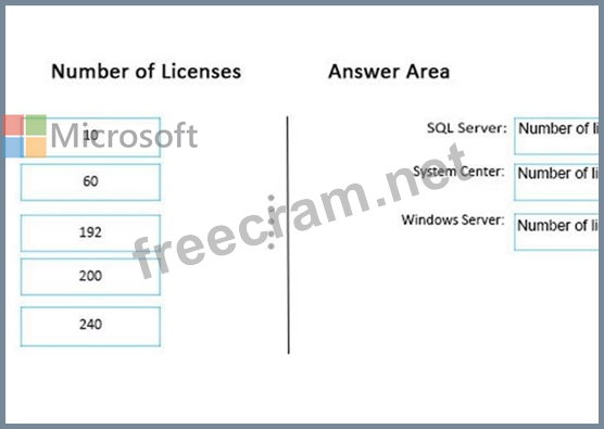 How many licenses should Fabrikam purchase for Windows Server, SQL Server, and System Center? To answer, drag the appropriate amounts to the correct products. Each amount may be used once, more than once, or not at all. You may need to drag the split bar between panes or scroll to view content.