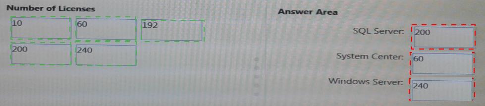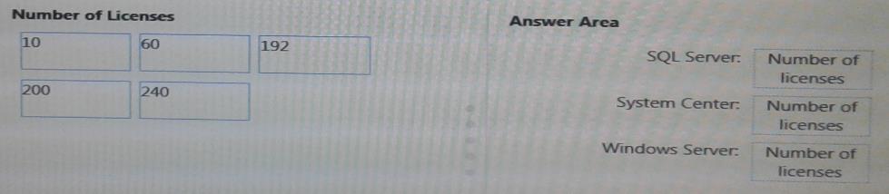 How many licenses should Fabrikam purchase for Windows Server, SQL Server, and System Center? To answer, drag the appropriate amounts to the correct products. Each amount may be used once, more than once, or not at all. You may need to drag the split bar between panes or scroll to view content- NOTE: Each correct selection is worth one point.