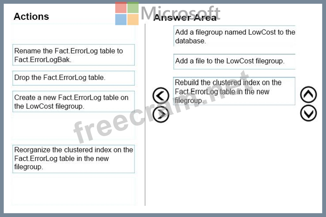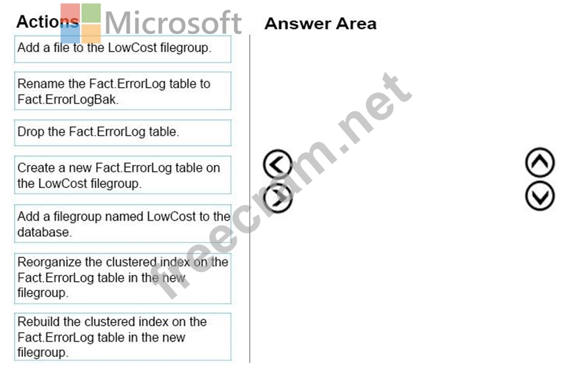 You need to move a table named Fact.ErrorLog to a new filegroup named LowCost.
