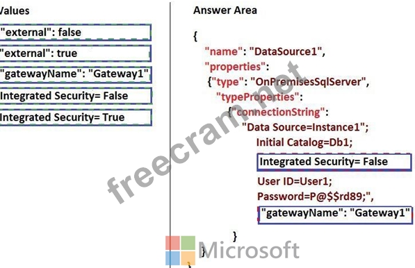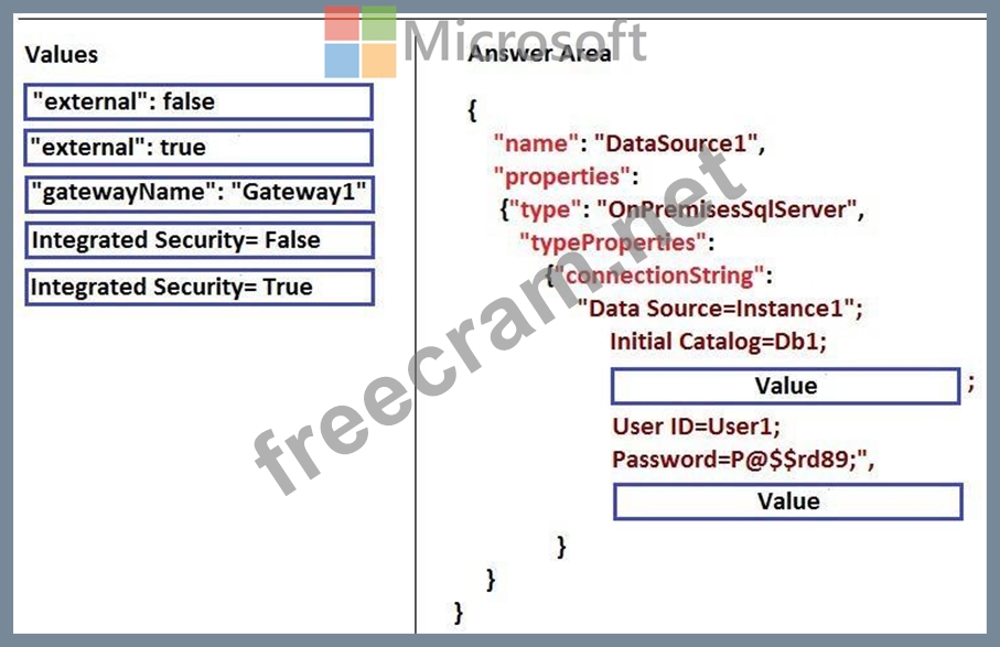 How should you complete the JSON code? TO answer, drag the appropriate values to the correct targets.