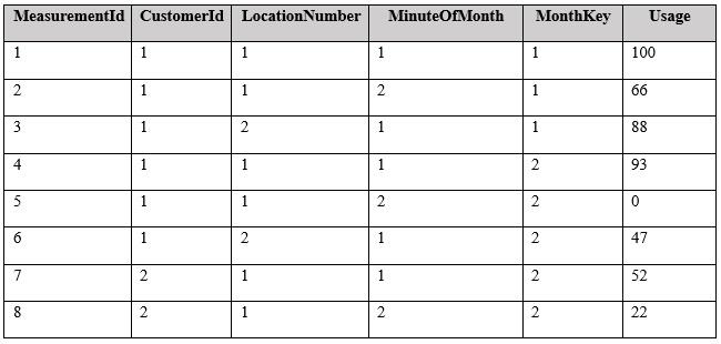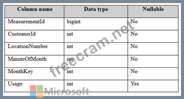 You have a fact table named PowerUsage that has 10 billion rows. PowerUsage contains data about customer power usage during the last 12 months. The usage data is collected every minute. PowerUsage contains the columns configured as shown in the following table.
