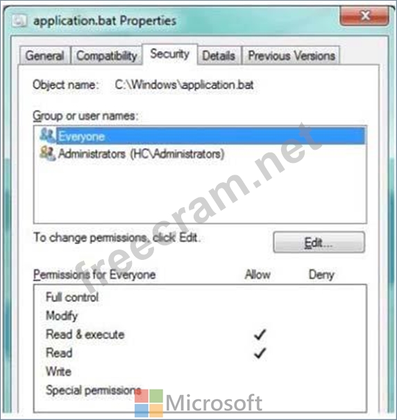 Your supervisor asks you to review file permission settings on the application.bat file.