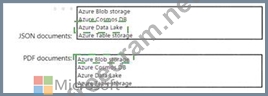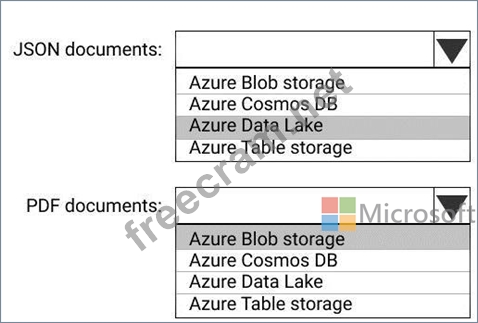 You need to build a sentiment analysis solution that will use input data from JSON documents and PDF documents. The JSON documents must be processed in batches and aggregated. Which storage type should you use for each file type? To answer, select the appropriate options in the answer area. NOTE: Each correct selection is worth one point.