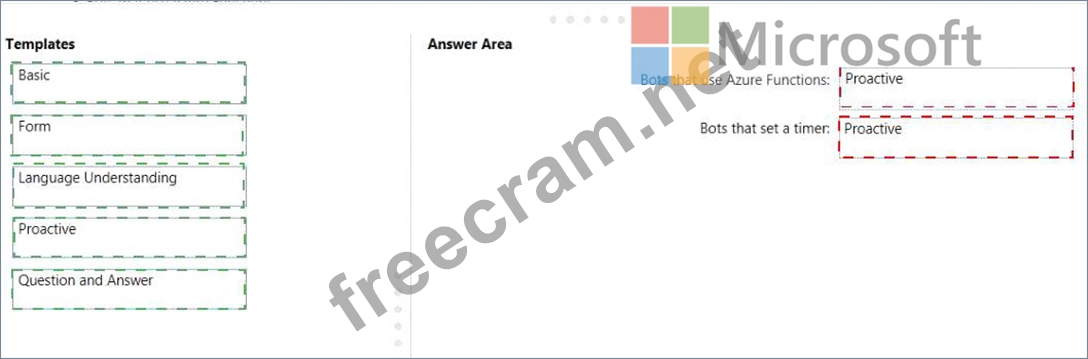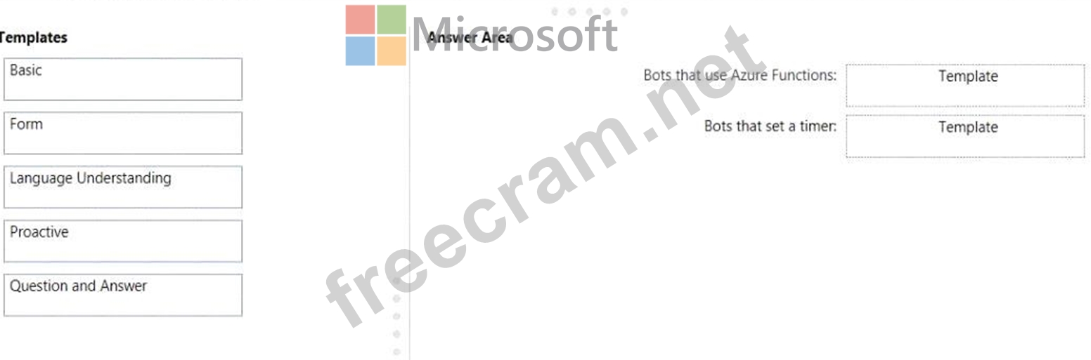 Which template should you use for each bot type? To answer, drag the appropriate templates to the correct bot types. Each template may be used once, more than once, or not at all. You may need to drag the split bar between panes or scroll to view content.