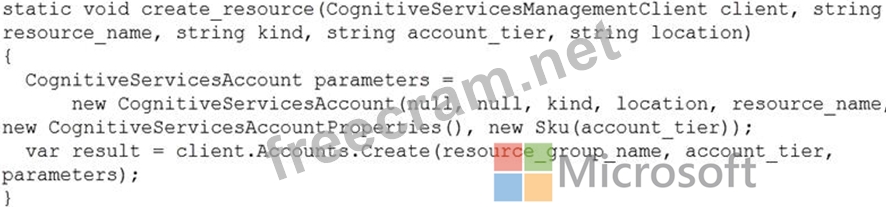 You have the following C# method for creating Azure Cognitive Services resources programmatically. You need to call the method to create a free Azure resource in the West US Azure region. The resource will be used to generate captions of images automatically. Which code should you use?