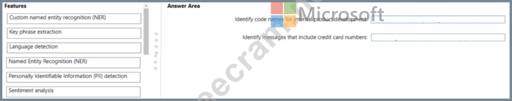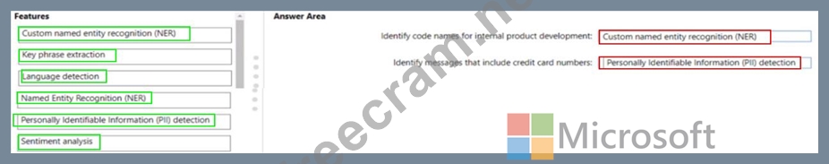 Which Azure Cognitive Service for Language feature should you use for each requirement? To answer, drag the appropriate features to the correct requirements. Each feature may be used once, more than once, or not at all. You may need to drag the split bar between panes or scroll to view content NOTE: Each correct selection is worth one point.