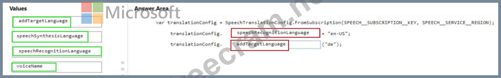 How should you complete the speechTransiationConf ig object? To answer, drag the appropriate values to the correct targets. Each value may be used once, more than once, or not at all. You may need to drag the split bar between panes or scroll to view content.