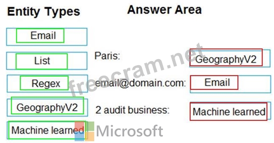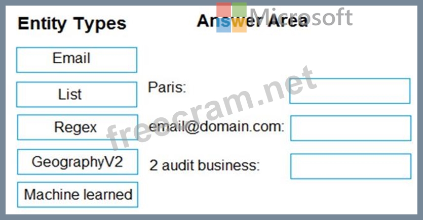 Which entity type should you use for each label? To answer, drag the appropriate entity types to the correct labels. Each entity type may be used once, more than once, or not at all.