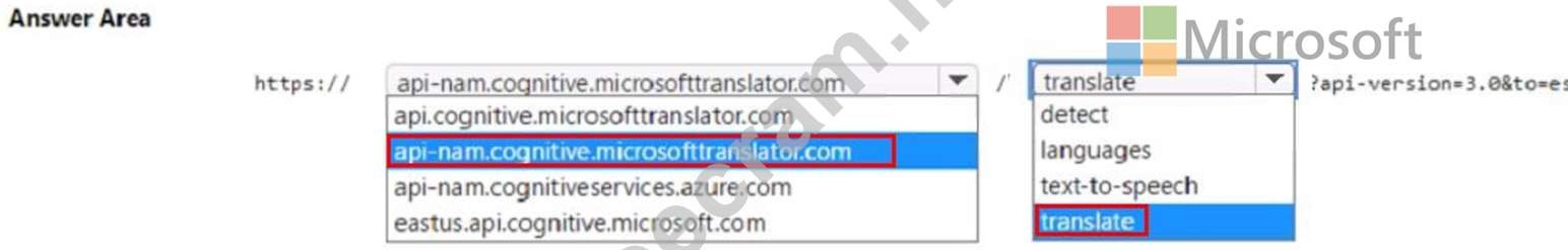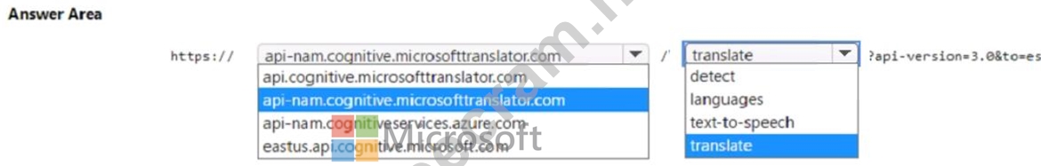 You need to use the Text Translation REST API to perform the translation. The solution must ensure that you have data sovereignty in the United States.