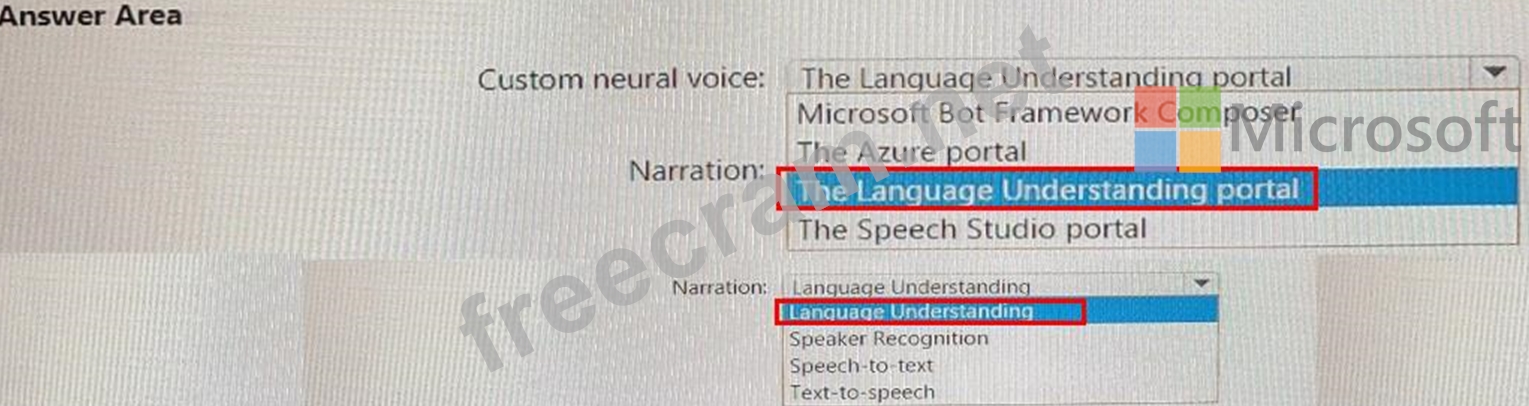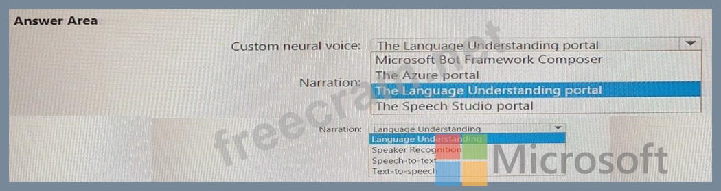 What should you use to create a custom neural voice, and which service should you use to generate the narration? To answer, select the appropriate options in the answer area.