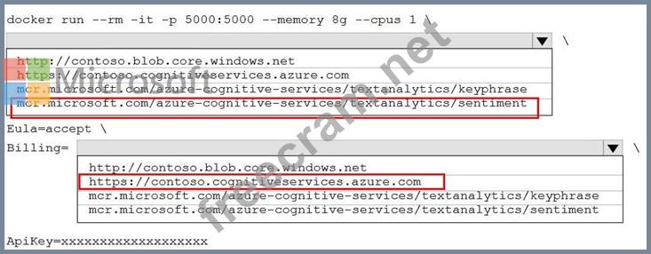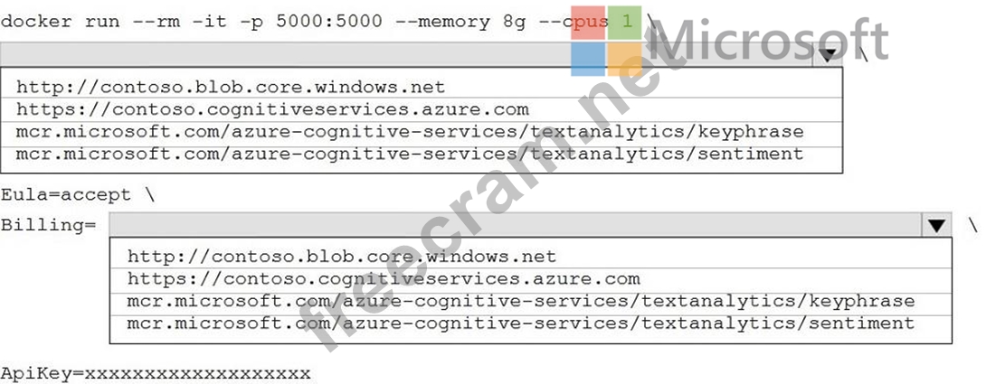 You configure https://contoso.cognitiveservices.azure.com as the endpoint URI for the service, and you pull the latest version of the Text Analytics Sentiment Analysis container.