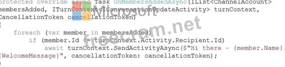 You are building a chatbot for a Microsoft Teams channel by using the Microsoft Bot Framework SDK. The chatbot will use the following code.