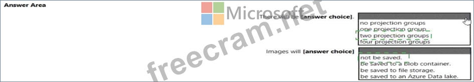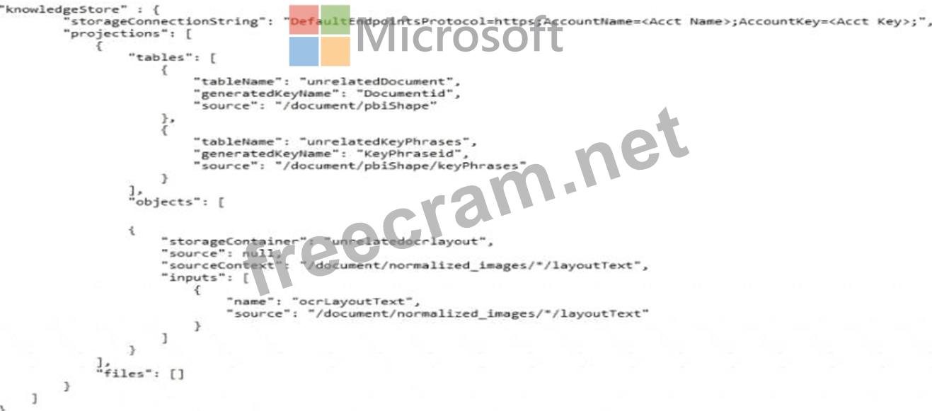 You create a knowledge store for Azure Cognitive Search by using the following JSON.