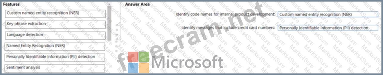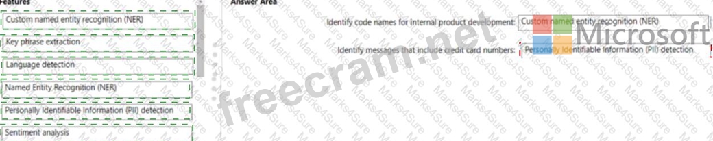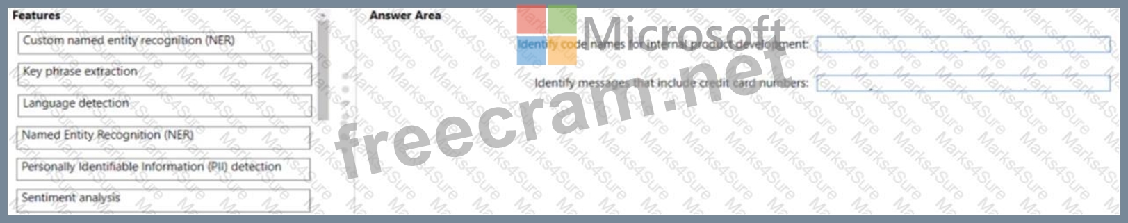 Which Azure Cognitive Service for Language feature should you use for each requirement? To answer, drag the appropriate features to the correct requirements. Each feature may be used once, more than once, or not at all. You may need to drag the split bar between panes or scroll to view content NOTE: Each correct selection is worth one point.