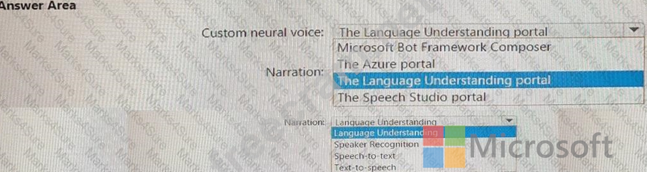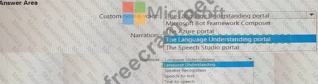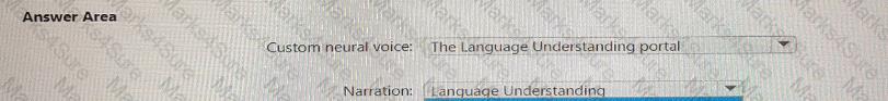 What should you use to create a custom neural voice, and which service should you use to generate the narration? To answer, select the appropriate options in the answer area.