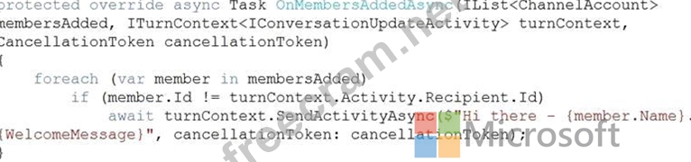 You are building a chatbot for a Microsoft Teams channel by using the Microsoft Bot Framework SDK. The chatbot will use the following code.
