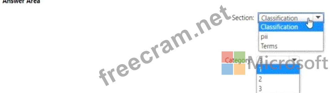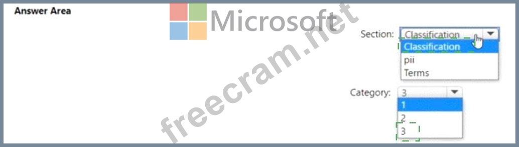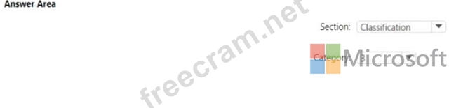 Which section in the response from the service will contain the category score, and which category will be assigned to the message? To answer, select the appropriate options in the answer area, NOTE: Each correct selection is worth one point.