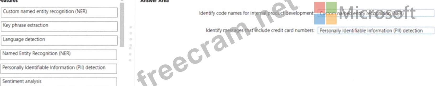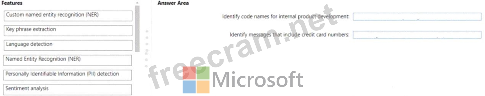 Which Azure Cognitive Service for Language feature should you use for each requirement? To answer, drag the appropriate features to the correct requirements. Each feature may be used once, more than once, or not at all. You may need to drag the split bar between panes or scroll to view content NOTE: Each correct selection is worth one point.