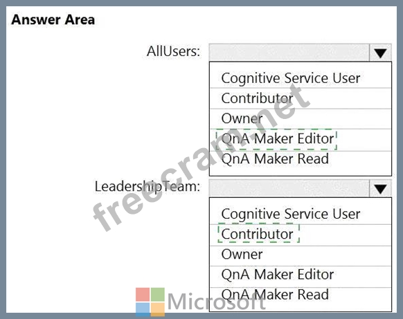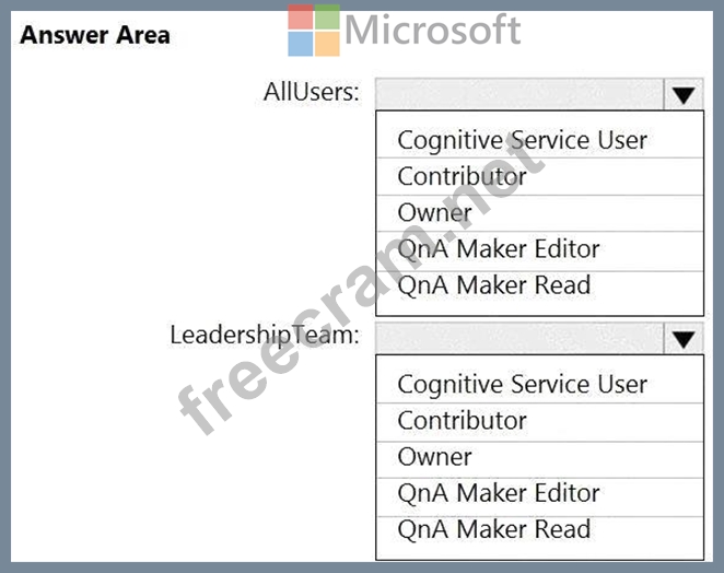 Which role should you assign to AllUsers and LeadershipTeam? To answer, select the appropriate options in the answer area.