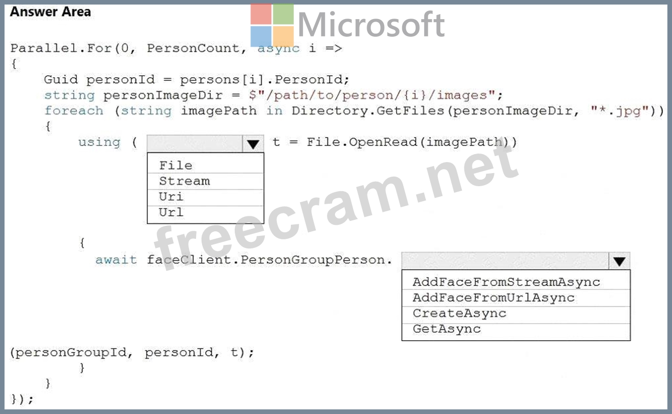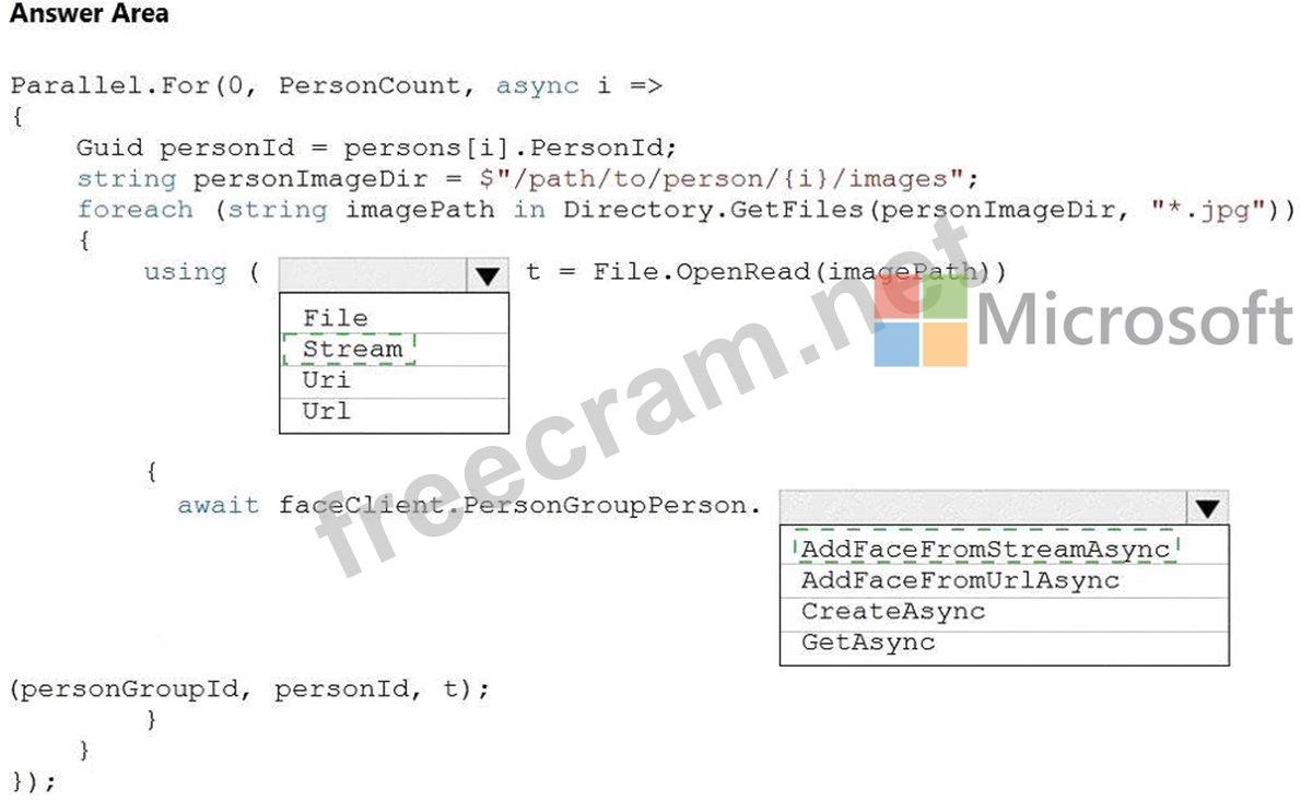 How should you complete the code? To answer, select the appropriate options in the answer area.