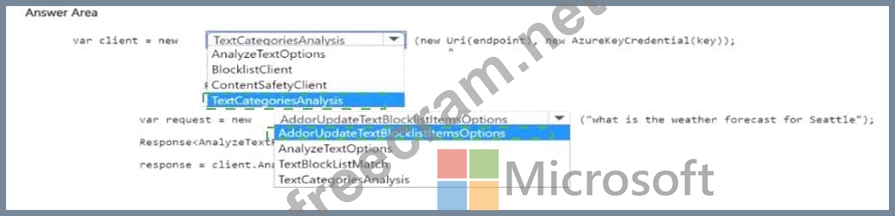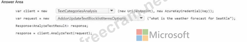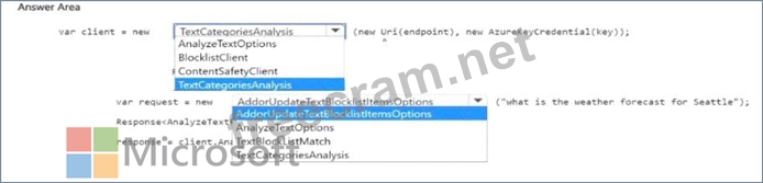 You have an Azure subscription that contains an Azure Al Content Safety resource named CS1. You need to use the SDK to call CS1 to identify requests that contain harmful content. How should you complete the code? lo answer, select the appropriate options m the answer area.