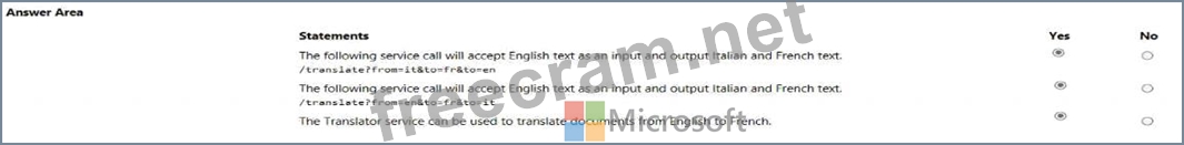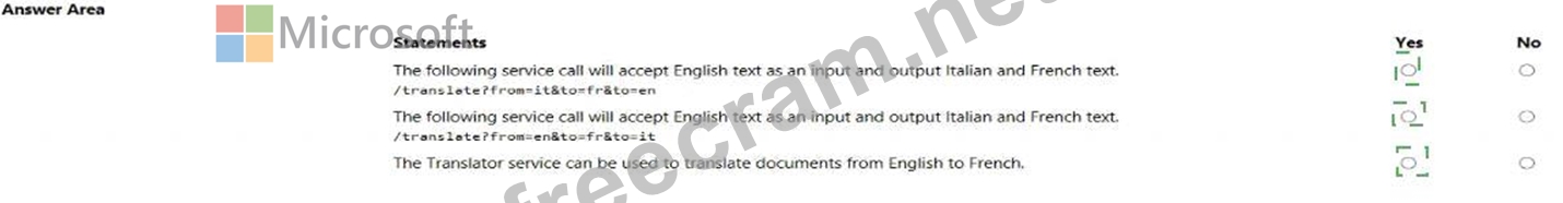The following service call will accept English text as an input and output Italian and French text. /translate?from=en&to=it&to=fr Yes. This call correctly specifies from=en (English) and to=it (Italian) and to=fr (French), meaning it translates from English to both Italian and French.