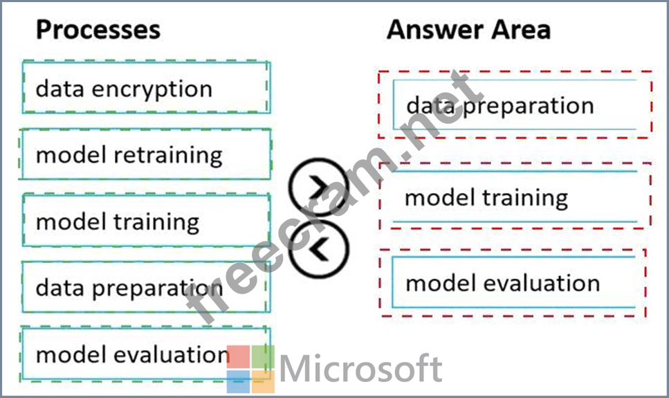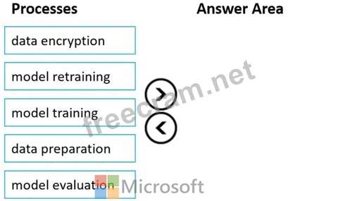 Which three processes should you perform in sequence before you deploy the model? To answer, move the appropriate processes from the list of processes to the answer area and arrange them in the correct order.