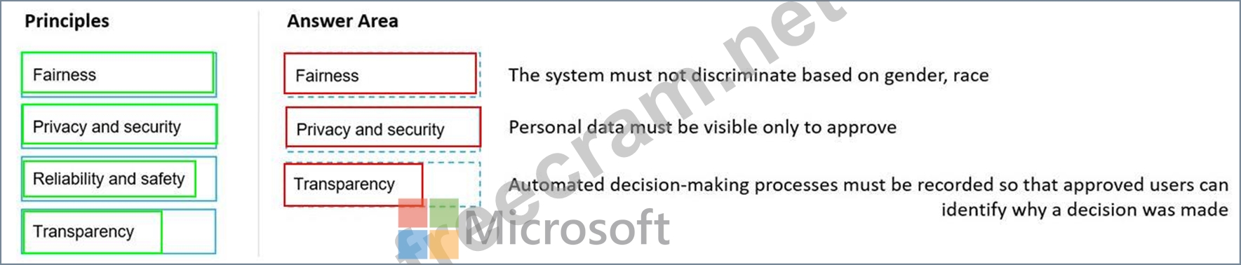 Question 45: Match the Microsoft guiding principles for responsible AI to...