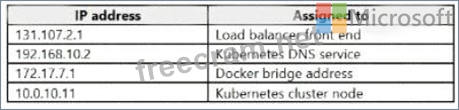 You deploy an Azure Kubernetes Service (AKS) cluster named Cluster1 that uses the IP addresses shown in the following table.
